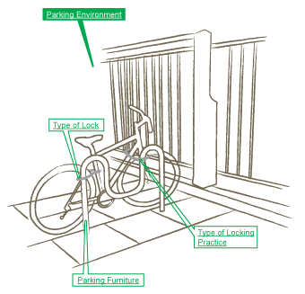 Bicycle theft prevention measures may include alterations or adaptations to any of these features of the wider parking environment. Many of these factors are interdependent. A well guarded and surveyed parking environment may require less secure cycle parking. A staffed facility that offers valet parking may allow for greater density of parking stands as fewer users are required to negotiate the parking area. Designed parking facilities typically have the opportunity to control the parking environment by considering each of these factors and the type of parking furniture used to make parking easy, safe and secure for cyclists but difficult and risky for thieves.