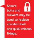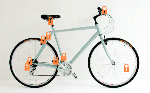 The illustration below shows the componential nature of a typical bicycle and indicates where secure bolts and skewers may be used to replace standard bolt and quick release fixings.
