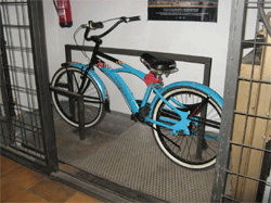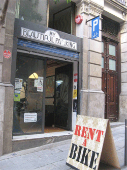 An underground bike parking facility serving Calle Cervantes 5, Barcelona Barcelona city. Parking is provided for up to 120 bicycles. It has 24-hour access, facilitated by a magnetic card. Between 1000-2000 it is open as a normal shop which repairs and rents bicycles. The facility offers a mix of parking spaces via different types of furniture, with lower pricing for the higher level of the racks. Additional spaces are offered via vertical storage hooks mounted to walls.