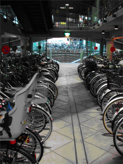 A self standing building bike parking facility created to reduce the number of bicycles parked on the street. Parking is provided for up to 2000 bikes. Access to the facility is open. The facility is open from 0630-2000 every day. Parking furniture is 4 floors of freestanding cycle parking, so bicycles are required to have kickstand legs. The facility is staffed until 2000 daily. Users can park for 24 hours, on single ticket use or 3 month subscriptions.
