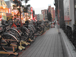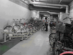 Underground and uncovered outdoor bike parking facility serving Asta Livin department store. Parking is provided for up to 1006 bicycles (80 freestanding for employees only). Access to the facility is open with outdoor parking and a ramp down to the underground parking area. Parking furniture consists of zigzag tier racks with inbuilt locks. These are controlled via vending machines that activate the locks and time the length of the stay in the facility. The whole system is called Cycle 21 and is made by Cycle Techno (one of the biggest bicycle parking solutions companies in Japan). Users can park 24hrs but typically intended for customer of the department store so the facility is staffed during the opening times between 0900-2200. The first two or three hours of parking are free and after that a ¥100 fee for every hour is charged (length of free time depends on where in the facility the user parks).