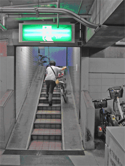 • The underground gate does not have an ejection band or conveyor belt to help customers descending to ground level with their bikes, often loaded with shopping bags
