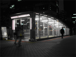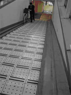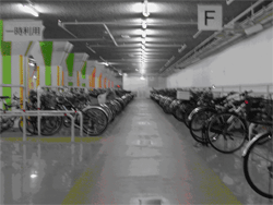 Underground bike parking facility Tamachi train station. Parking is provided for up to 1200 bicycles plus 50 motorcycle spaces. The facility is open access. It has ejection bands (conveyor belts) for the departing bicycles, and downhill ramps for the arriving bicycles. Parking furniture consists of metal tube structures acting as fences to organise lots of bicycles in order to keep them within the boxes marked on the floor. Bicycles are allowed to stay 24 hours, but the facility is only open 20 hours a day, from 0430-0130. Users can pay a daily ticket (£0.75) but also a monthly subscription (£9). The site is staffed, and there is also a CCTV security System.