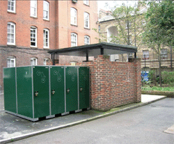 Located in Hackney, East London, the Frampton Park Estate contains 56 2m high bicycle lockers for 1160 flats that previously had no bicycle parking provisions. Despite having more than adequate car parking spaces and garages 69% of households did not own a car (2001 Census data). The estate consists of post-war medium and high-rise blocks, some with working lifts but many without. Bikes were stored/locked in communal walkways, at high risk of theft and vandalism.