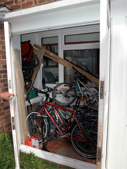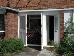 An example of how homes can be customized to accommodated bikes more efficiently. The owner felt the front porch was wasted space and he thought he should use it more efficiently. So the entrance has been changed into cycle storage and offers security as bicycles are not visible from the inside. The facility provides parking for an average of 5 bikes. Access to the facility is via the entrance door, which has strong locks.