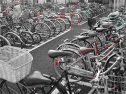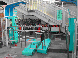 Overground uncovered bicycle parking serving Musashi Koganei Station. Parking is provided for 357 bicycles. Access is controlled by automatic tollgates, which read not only access control cards but detect the two wheels of each bike that enters or leaves this facility; the system controls stainless steel barriers. Inside the parking there are floor-marking boxes enclosed by bent tube corridor dividers, with steel wire mesh fences that enclose the whole area. The facility is intended to be unguarded but is monitored by CCTV. Users can park 24hrs, monthly subscription ¥1900 (£9.50). Monthly subscription ¥1500 (£7.50 students) with daily (24 hours) ticket costing ¥100 (£0.50).