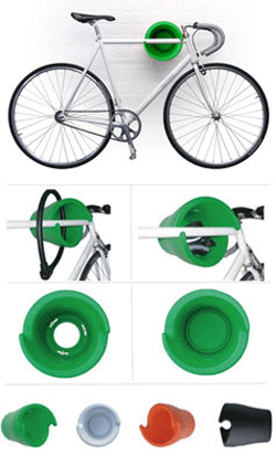 The Cycloc was originally designed for domestic indoor environments where floor space is limited. The design is a variation of the wall hook storage solutions that are widely available. Cycloc's unique shape, combined with your bike's own weight, holds the bike in place. A hole through the middle allows you to fit a bike lock to secure the frame. After securing to the wall a matching insert panel neatly conceals the fixings. Slotted mounting holes allow Cycloc to rotate to suit the angle of the top tube accommodating a range of frame shapes and sizes – so your bike is stored horizontally.