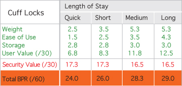 The table below gives a 'user value' out of thirty, in green, and a 'security value' out of thirty, in red. The total value, out of sixty, gives the overall Bikeoff Performance Rating (BPR). If the Bikeoff Performance rating is in green then the lock is 'user biased', a red rating denotes 'security bias' and a yellow rating indicates an equal performance in relation to user and abuser considerations meaning the lock is a 'good all rounder'. Lock performance is also considered in relation to length of stay to indicate how increased risk (more time parked unattended) impacts on user and abuser values, e.g. lighter, and less secure locks will have a much lower BPR for long stops than for quick stops.