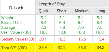 The table below gives a 'user value' out of thirty, in green, and a 'security value' out of thirty, in red. The total value, out of sixty, gives the overall Bikeoff Performance Rating (BPR). If the Bikeoff Performance rating is in green then the lock is 'user biased', a red rating denotes 'security bias' and a yellow rating indicates an equal performance in relation to user and abuser considerations meaning the lock is a 'good all rounder'. Lock performance is also considered in relation to length of stay to indicate how increased risk (more time parked unattended) impacts on user and abuser values, e.g. lighter, and less secure locks will have a much lower BPR for long stops than for quick stops.