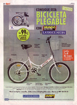 In 2005 the Spanish broadsheet “La Vanguardia” stimulated a new breed of cyclists around Barcelona by making a new folding bicycle available for under €100. The promotion involved collecting coupons from the paper to claim the bike at its subsidised rate between June and July 2005.